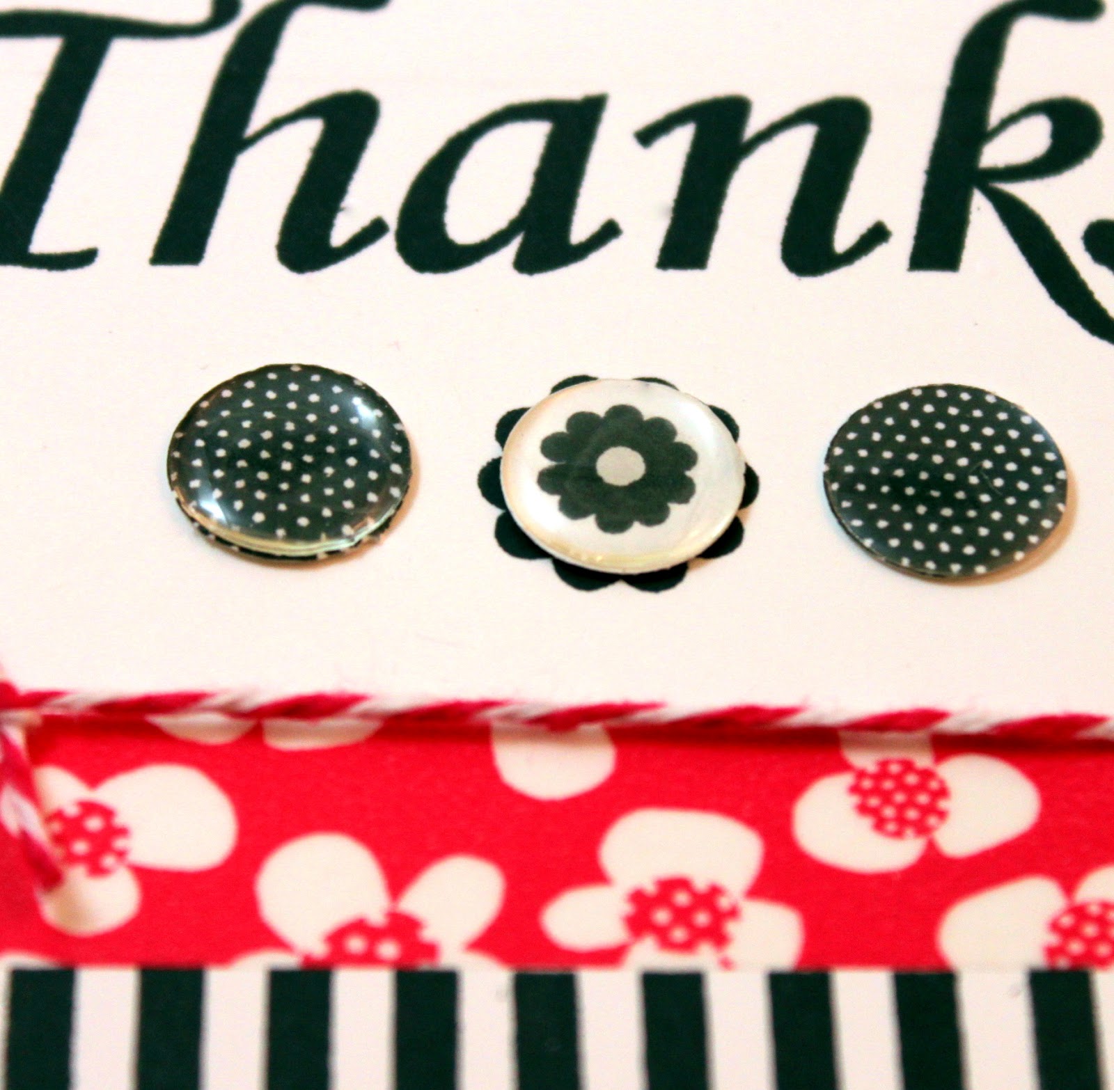For this card, I stamped the black lines along the bottom using the striped block from the Stamp it BIG set. I added a strip of washi tape (that I received for Christmas from a dear friend--Thanks Michelle!) on top of it. I stamped the thanks sentiment in Memento tuxedo black ink and then underneath, I stamped the large flower from the set. Using another piece of white cardstock, I stamped the polka-dotted block stamp from the set twice and the small flower once. I used a small circle punch to punch the circles from the stamped designs and covered them with old brad covers I had from Stampin' Up! They look really shiny IRL!